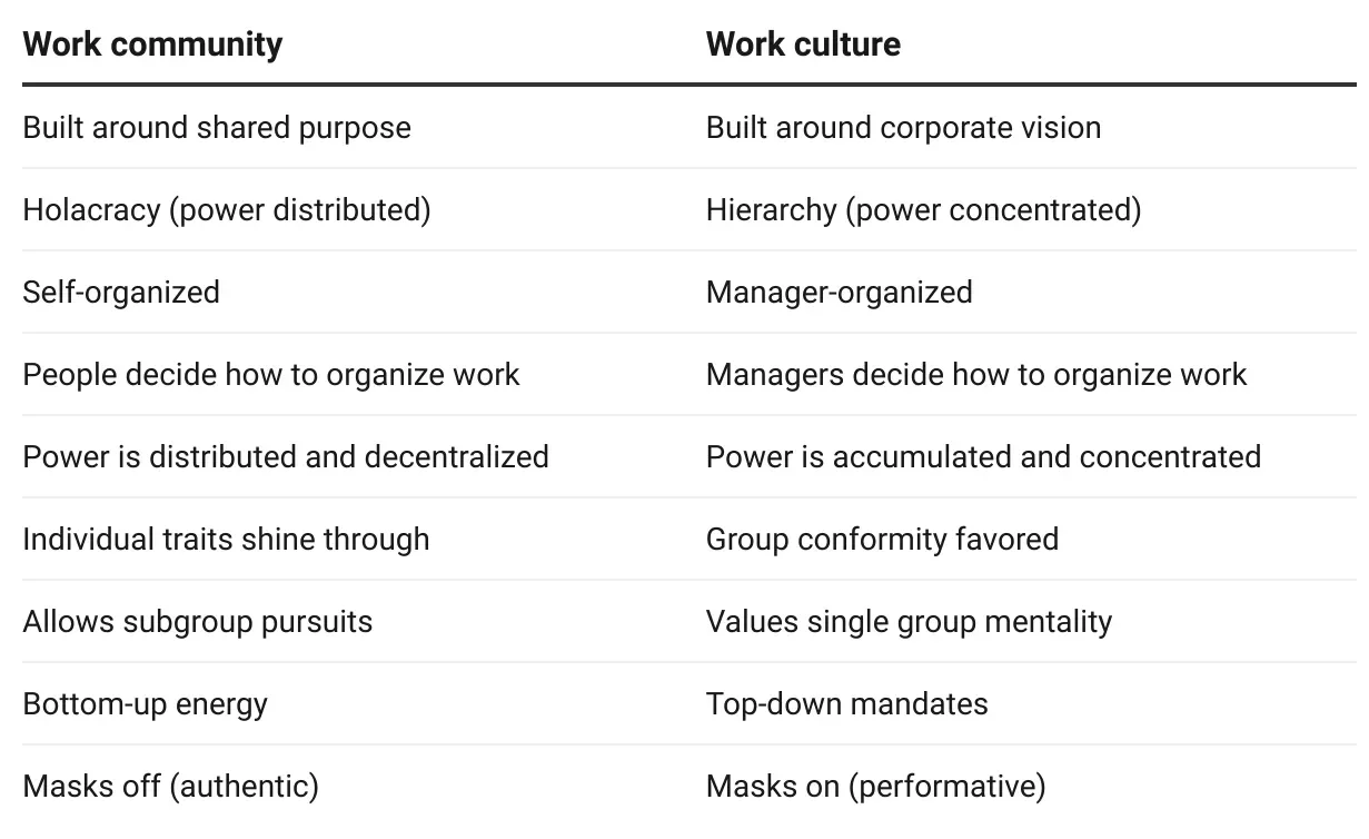 Here's what I've observed after years of comparing the ethos of real communities versus workplace cultures.